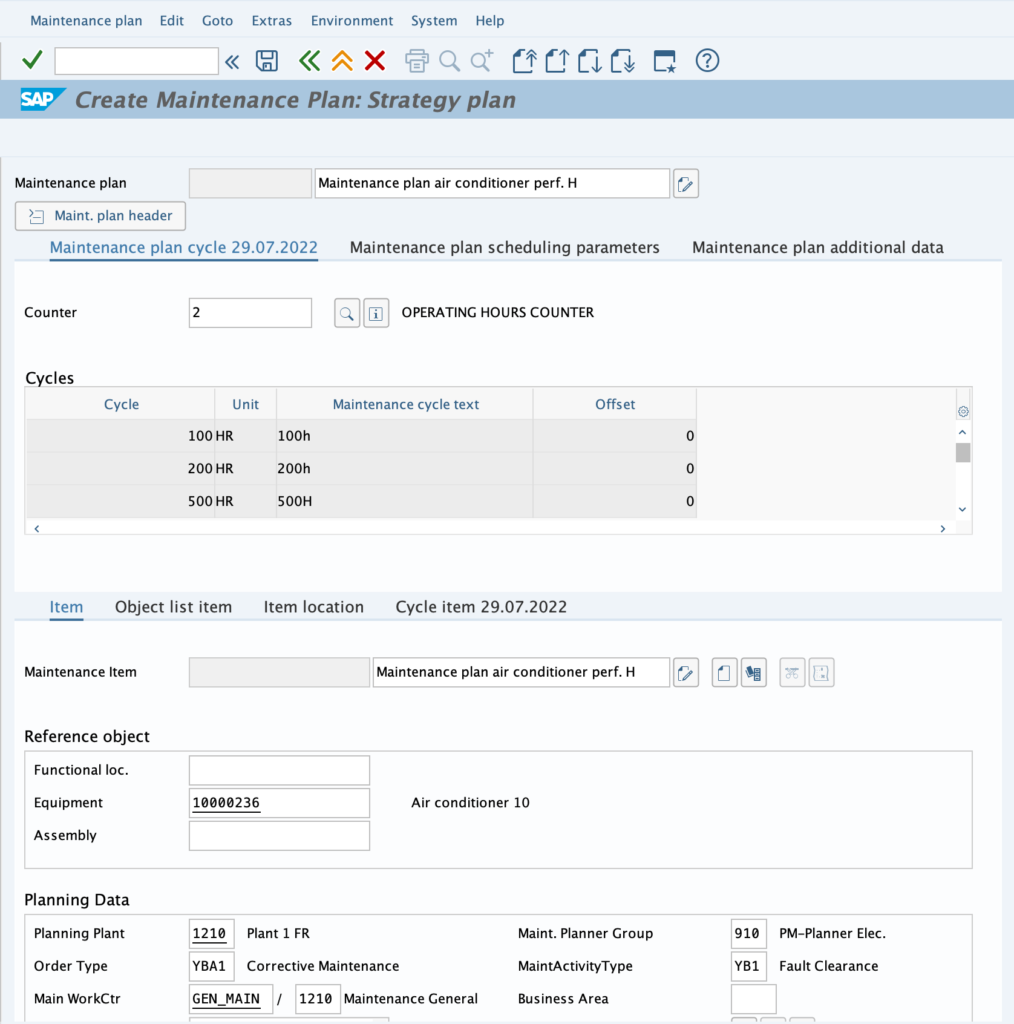The Maintenance Plan contains the different dates / cycles of interventions, as well as other planning parameters. In addition, it also contains one or more Maintenance Item(s). Then, it also contains the Call Object information (Order, Notification...).